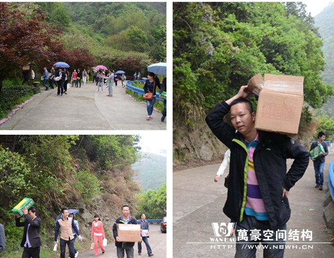 經(jīng)過1個多小時的車程,到達四明山的腳下,男同事開始搬運中午的美食上山了!
