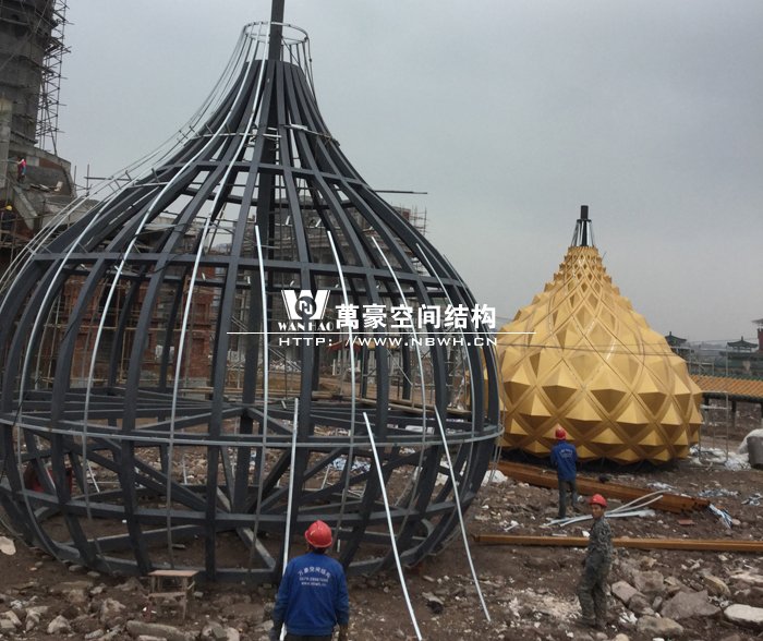 俄羅斯館鋼結構階段,館頂鋼結構正在制作施工中。
