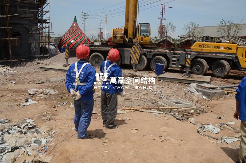 橫店俄羅斯館屋頂鋼結構裝飾球吊裝 俄羅斯館鋼結構階段 牡丹花仙湖看臺膜結構工程效果圖