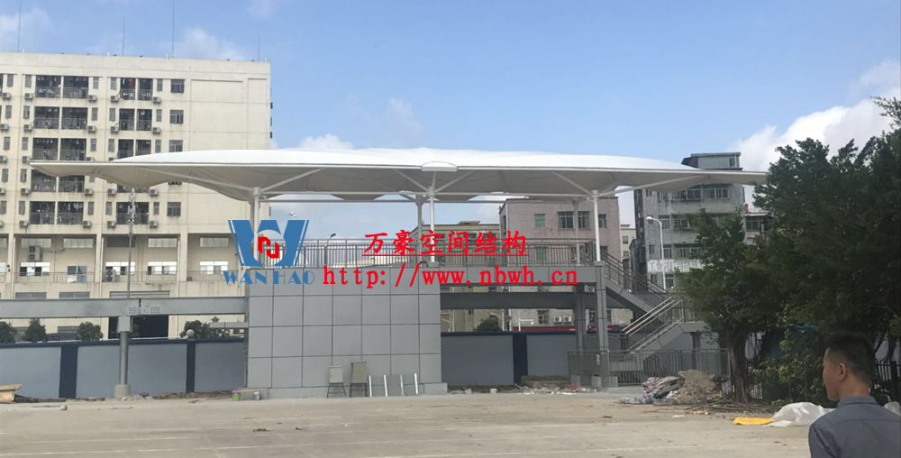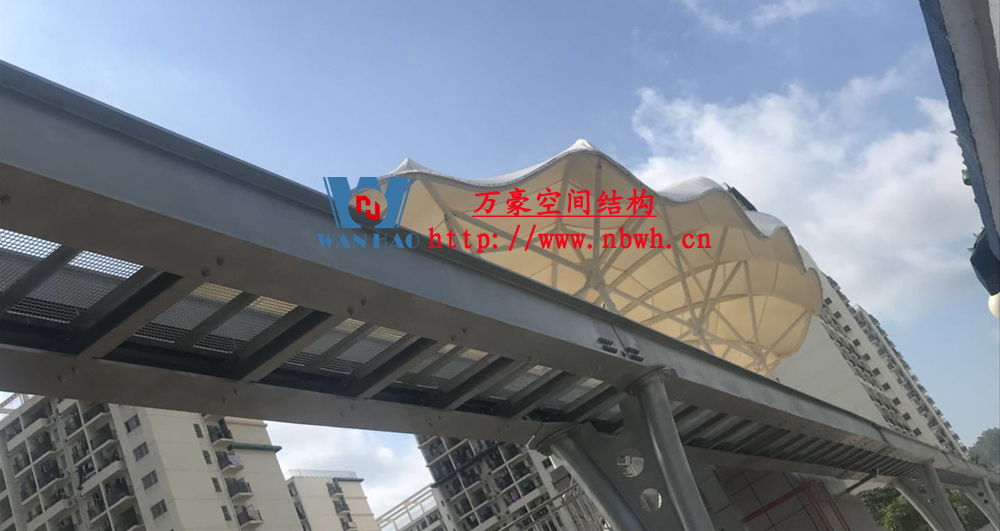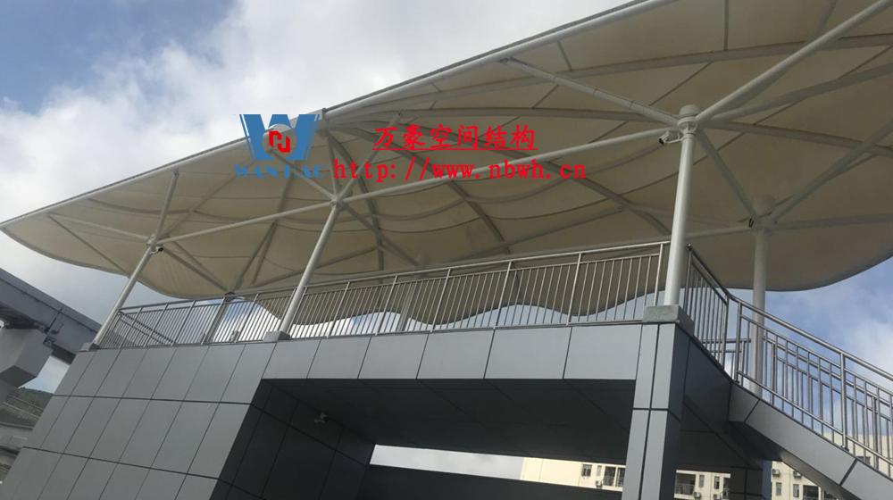 云巴園區(qū)試驗(yàn)示范線膜結(jié)構(gòu)工程-四角站(原名:坪山一期生產(chǎn)園區(qū)C型線云軌站)位于深圳市坪山區(qū)比亞迪路3009號(hào)比亞迪股份有限公司園區(qū)四角大廈西面,該工程用鋼量50噸,膜材展開面積2000平方米,遮蓋材質(zhì)選用最為優(yōu)質(zhì)的ETFE膜材(日本旭硝子),鋼構(gòu)則選用了起拱和各種大小圓弧相融合。