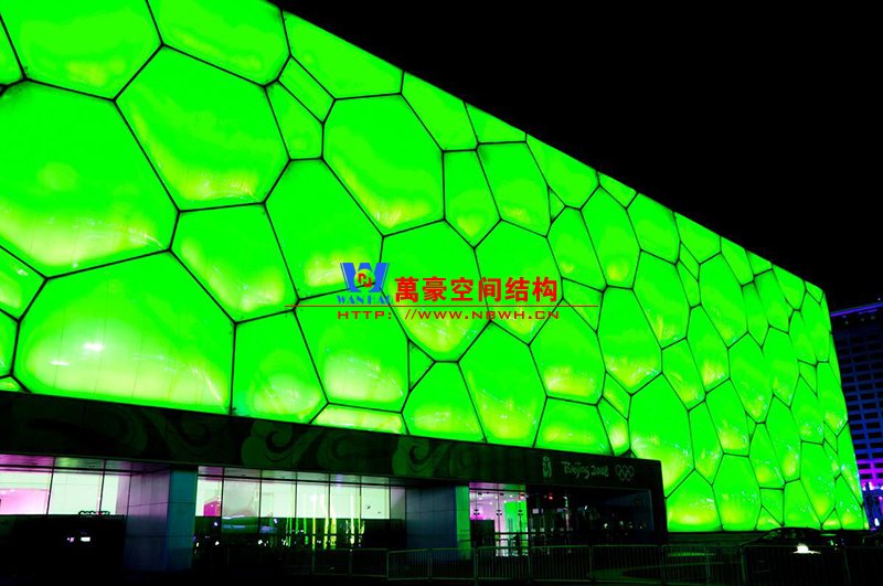 水立方是我國首次使用ETFE充氣式膜材料。在水立方尚未建造之前,我國還沒有在幕墻中使用ETFE膜材料的先例。水立方的整個建筑中除了入口處用了玻璃之外,其他地方全部采用充氣膜材料,內部沒有一根柱子。ETFE充氣膜材料在歐洲有十多年的運用歷史,基本上都是用在游泳館和冬季花園建筑方面的,它質量輕、保溫隔熱性好,同時還有透光、防雨、自潔等特點,最大的充氣膜材料建筑達3萬平方米。