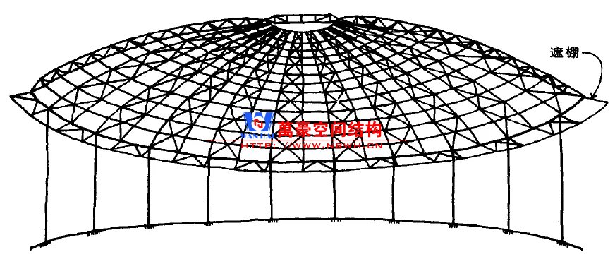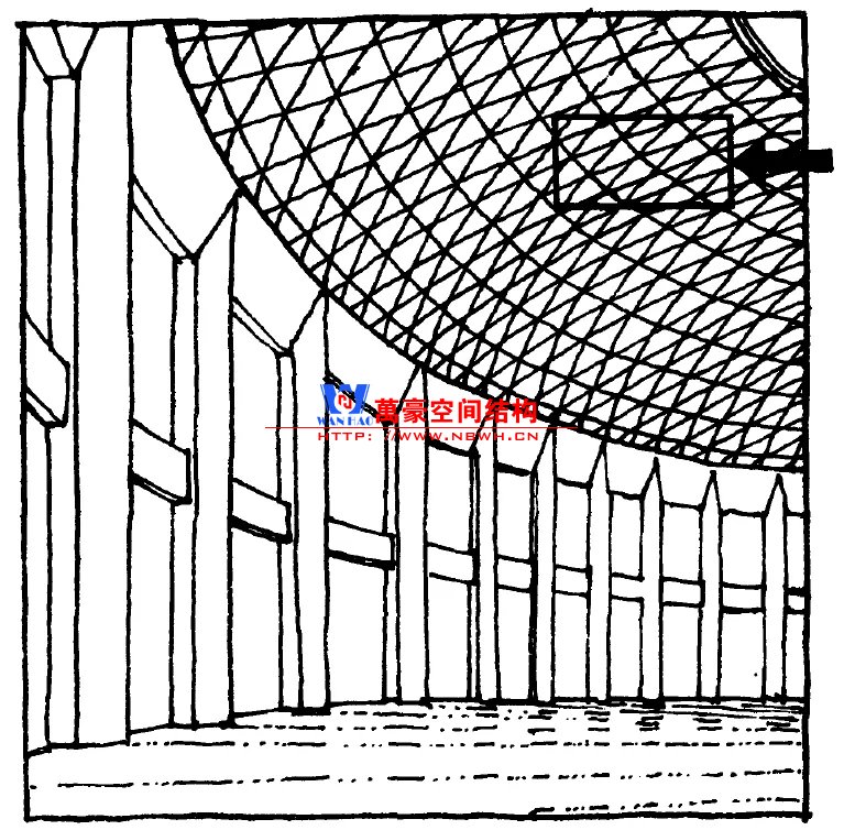 提高平面內剛度的直接方式是采用三角形網格。富勒發明了短線呈穹頂,并應用于1967年蒙特利爾國際博覽會上的美國館——一座直徑為76m的3/4球形建筑。