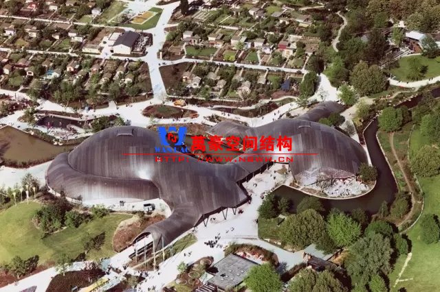 施萊希采用了四邊形網格劃分的球殼。網格桿件承擔軸力,增設拉索拉結對角節點,保證四邊形網格的穩定性。