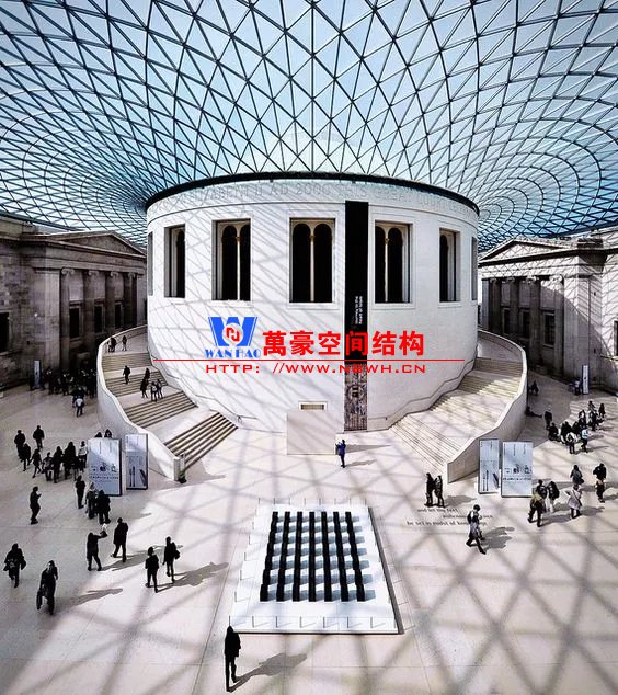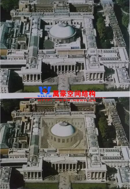 這個(gè)經(jīng)典的改造項(xiàng)目把輕與重巧妙組合。鋼結(jié)構(gòu)網(wǎng)殼內(nèi)側(cè)支承于圓形閱覽室,外側(cè)支承于方形博物館建筑的內(nèi)墻,通過找形分析得到一個(gè)拱起的規(guī)則形態(tài)。
