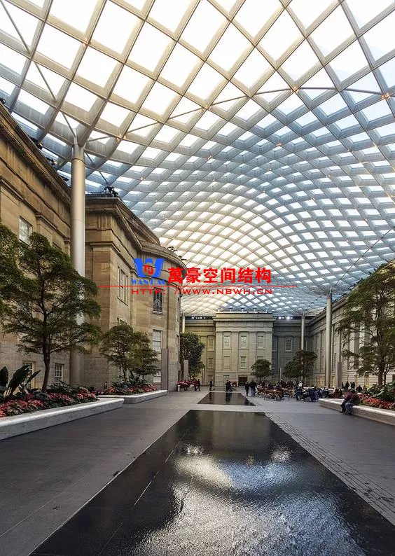 原有博物館建筑為天幕提供了一個(gè)堅(jiān)固的邊界條件,使得網(wǎng)殼可以充分發(fā)揮形體的作用。構(gòu)件以軸力為主、截面纖細(xì),極大地突出了整體通透明亮的建筑效果。