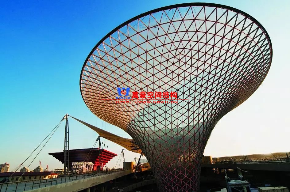 規(guī)則曲面的天幕一般采用鋼結(jié)構(gòu)網(wǎng)殼形式,利用網(wǎng)殼曲面的形抗原理,結(jié)構(gòu)以軸向受力為主、效率高,以較小的截面尺寸即可實(shí)現(xiàn)很大跨度。這一類網(wǎng)殼曲面多為圓柱面、球面。