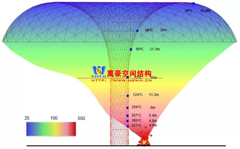 根據(jù)消防規(guī)范,中庭鋼結(jié)構(gòu)要涂防火涂層以提供1.5~3小時(shí)的耐火保護(hù)。通過性能化分析,設(shè)計(jì)師提出創(chuàng)新的水簾保護(hù)系統(tǒng)作為鋼材防火替代方案。水簾經(jīng)由氣化,可以吸收火與煙霧大部分熱量,使鋼材表面溫度顯著降低。