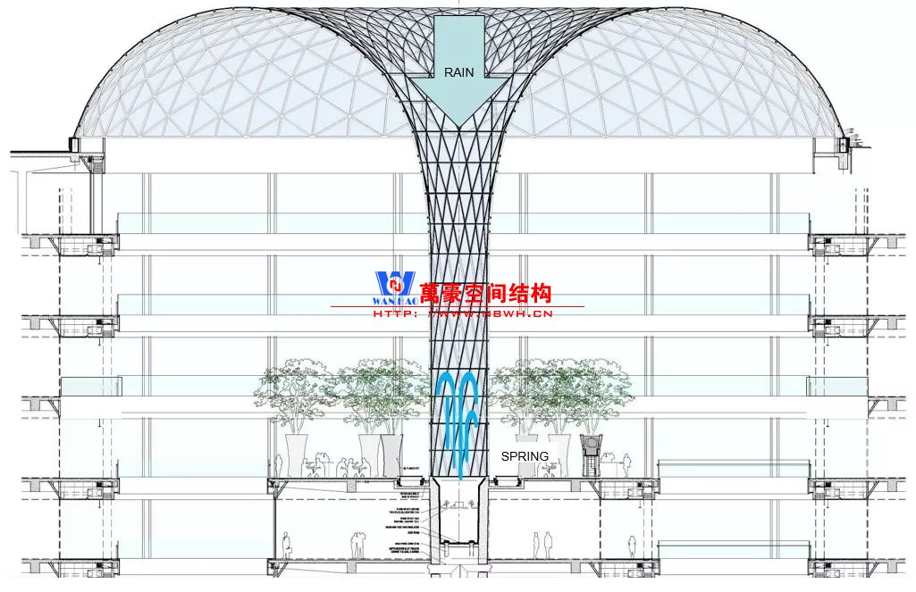 巨大透明天幕能增強(qiáng)自然采光和視覺通透性,然而另一方面,也帶來眩光和太陽熱輻射增加等潛在問題。因此,設(shè)計(jì)師采用低輻射鍍膜玻璃、通風(fēng)裝置和氣簾、雨水收集系統(tǒng)等兼顧了訪客的最佳舒適度和綠色生態(tài)品質(zhì)。