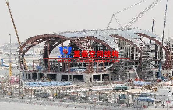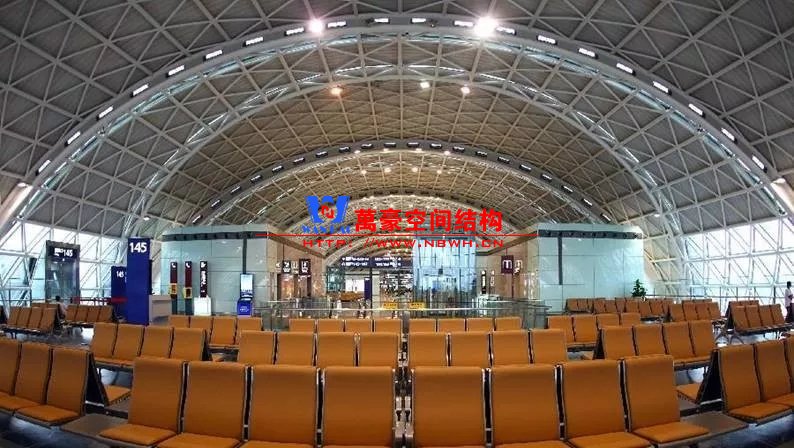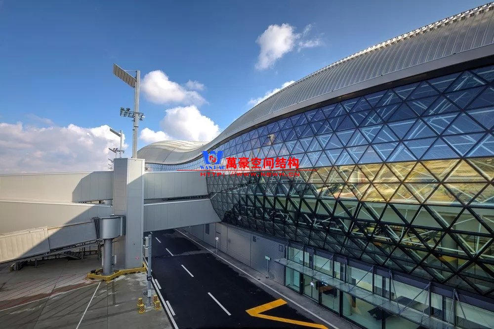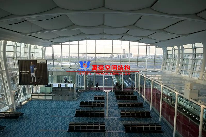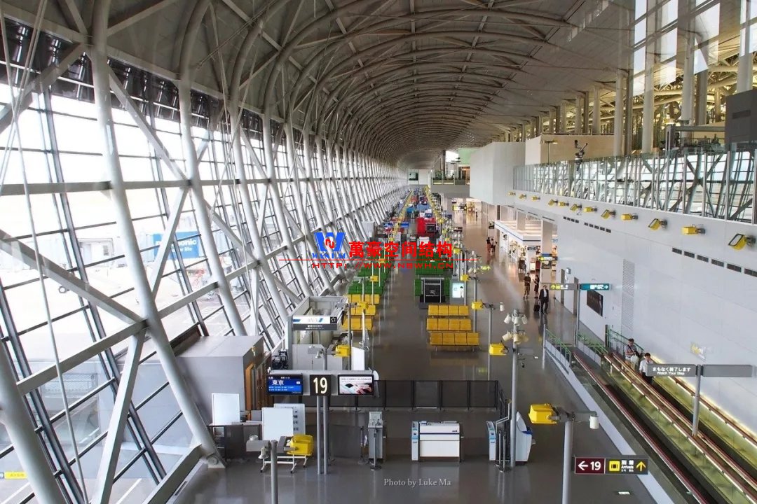 大阪關(guān)西機(jī)場(chǎng)則采用弧形鋼梁+索的結(jié)構(gòu)體系,有效減小了鋼梁尺寸,同時(shí)由于沒(méi)有天窗光線作用,鋼索并不明顯。可能是由于日本是地震多發(fā)地區(qū),外露的支撐構(gòu)件比較多略顯雜亂。