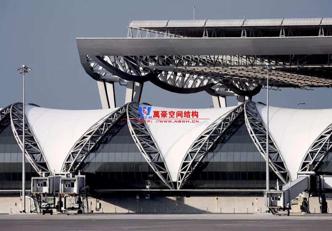 曼谷素萬(wàn)那普機(jī)場(chǎng)同樣的形式設(shè)計(jì)出了不同的效果。前面兩個(gè)機(jī)場(chǎng)在室外是平滑的,而素萬(wàn)那普機(jī)場(chǎng)選擇了空間桁架結(jié)構(gòu),且讓桁架暴露在建筑立面外側(cè),形成建筑表達(dá)的一部分。結(jié)構(gòu)體系從剖面上看利用了類似三鉸拱的概念,同時(shí)桁架高度與彎矩圖相符。立面則選用了剛性幕墻,整個(gè)建筑表達(dá)出了結(jié)構(gòu)的力度感。