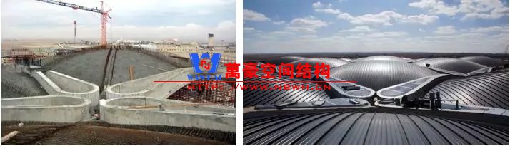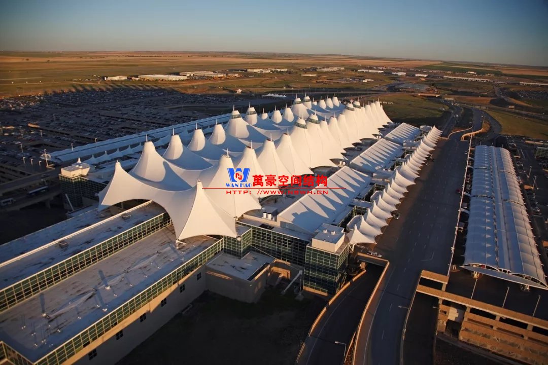 除了以上相對(duì)比較常見的結(jié)構(gòu)類型,還有一些是不太常見的樣式,且基本上只此一例別無(wú)他家。如丹佛機(jī)場(chǎng)則采用了膜結(jié)構(gòu),潔白的膜層層疊疊與遠(yuǎn)處的雪山交相呼應(yīng),建筑效果很特別。那為何很少有機(jī)場(chǎng)大范圍采用膜結(jié)構(gòu)呢?可能和膜結(jié)構(gòu)的熱工性能和使用年限有關(guān)系,夏熱冬冷不節(jié)能。同時(shí)膜結(jié)構(gòu)對(duì)形態(tài)的適應(yīng)性比較差,需要特定的建筑樣式才能遷就膜結(jié)構(gòu),而不像鋼結(jié)構(gòu)基本能適應(yīng)任何建筑造型。因此建筑師如果想選擇膜結(jié)構(gòu),需要和結(jié)構(gòu)工程師在早期有更多的溝通。