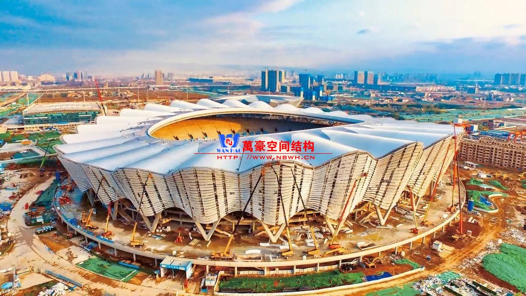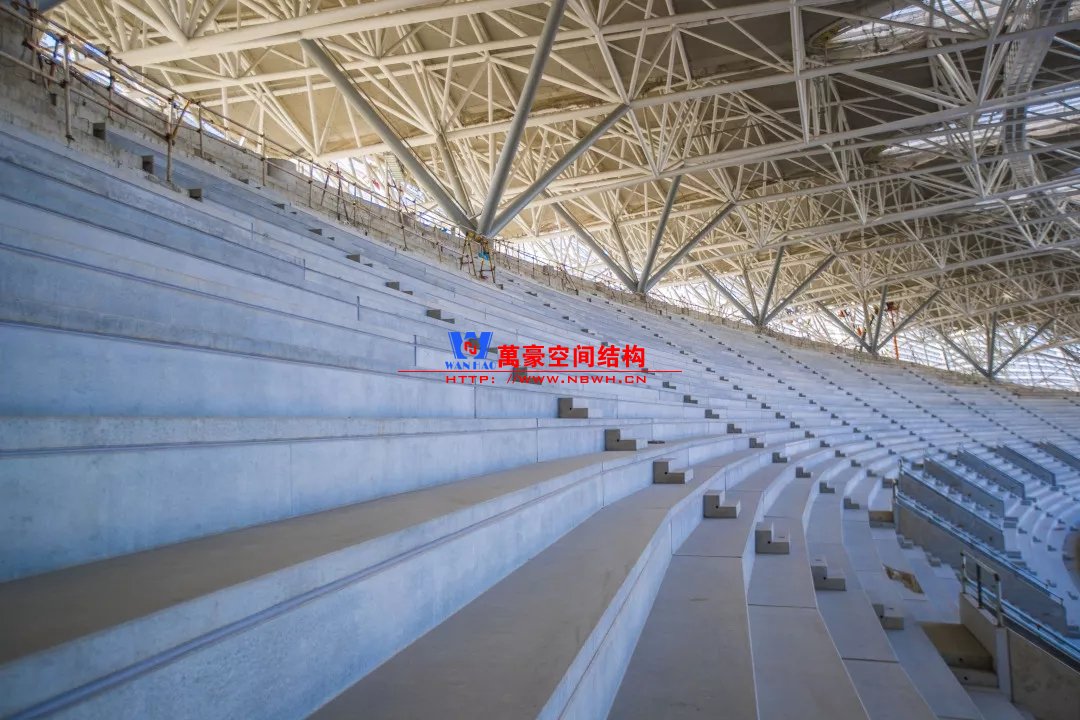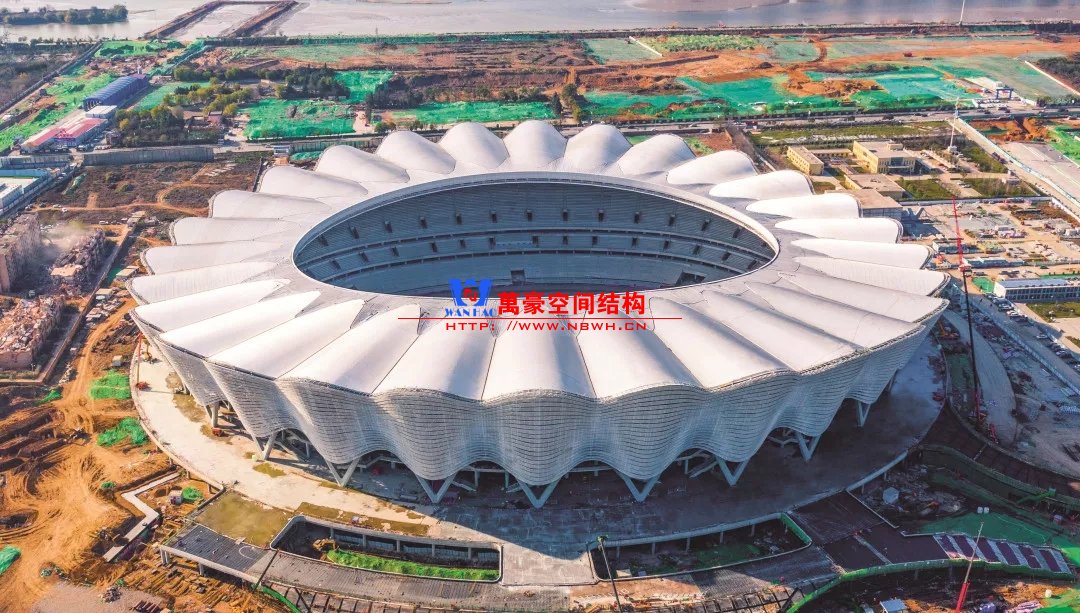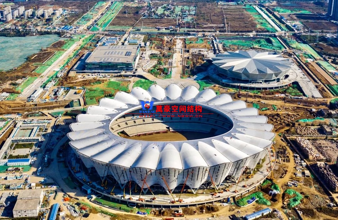 體育場主體建筑為南北長332m、東西寬316m的橢圓形,鋼結構罩棚最高處高58.3m,最低處高42.6m;中間開口南北長200m、東西寬153m。主體鋼結構采用空間懸挑鋼桁架結構,由28個V形柱支撐72片鋼結構管桁架,整體東西高,南北低,呈馬鞍形,體育場看臺為框架-剪力墻體系。屋頂圍護結構為鋁鎂錳直立鎖邊金屬屋面,罩棚立面采用銀白色穿孔鋁板幕墻系統,通過有韻律的變化,表達了絲綢飄舞的動感,輕盈通透的罩棚在夜晚能夠透出賽場內熱烈的賽事氣氛,宛如皓月長空下綻放的盛世之花。碗型看臺分為上、中、下三層座席,并在中上層看臺之間設置包廂層(包括66個大小包廂)及其座席區,觀眾分別由各層看臺對應的通道進入。