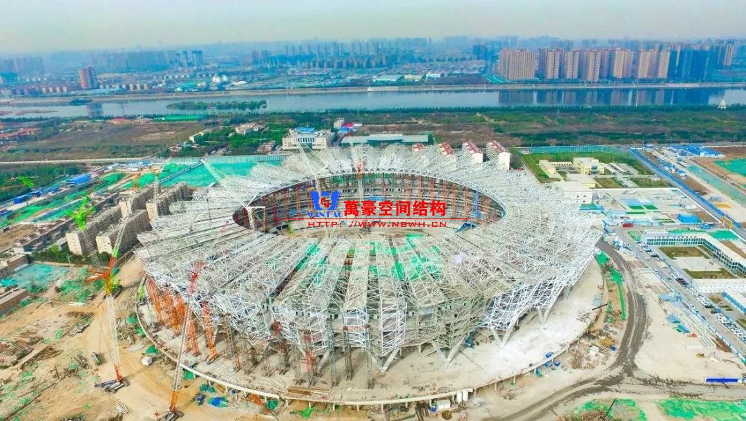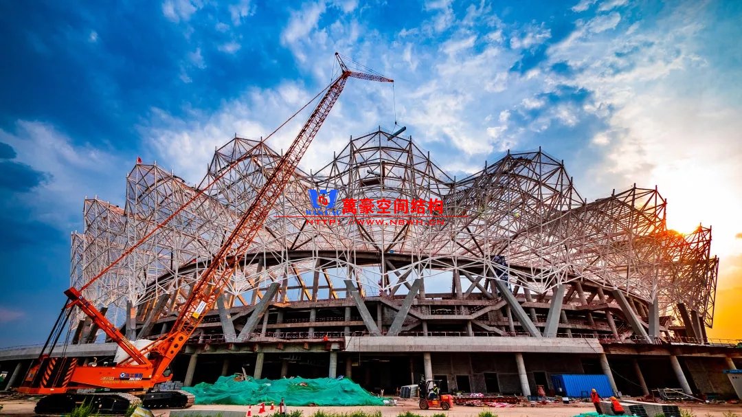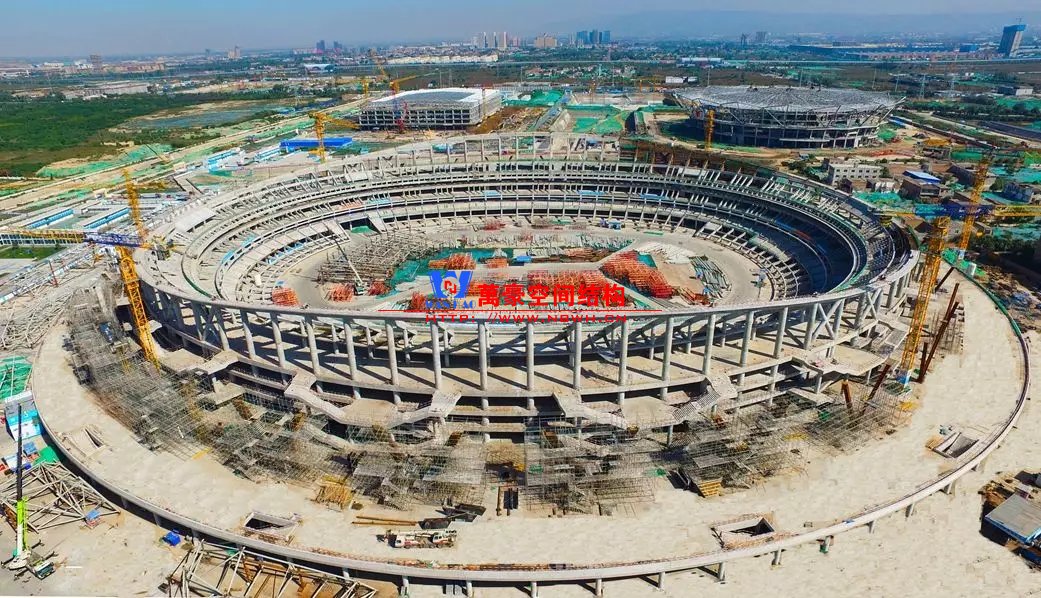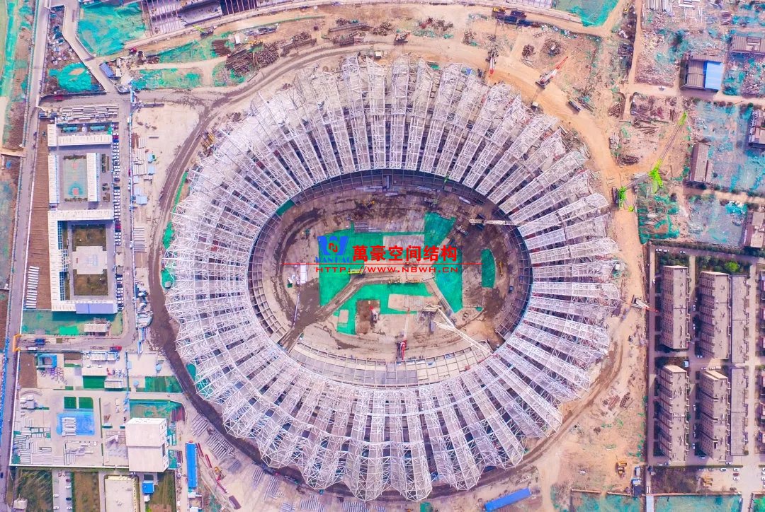 體育場罩棚整體造型呈馬鞍形,采用空間管桁架懸挑結構體系,南北長332m,東西寬316m,罩棚最高58.3m。2019年1月1日首吊,鋼結構分包中建鋼構歷時87天,消耗近5萬工日、逾5千機械臺班,完成168單元、9500噸罩棚鋼桁架吊裝工作,于3月28日提前合攏。