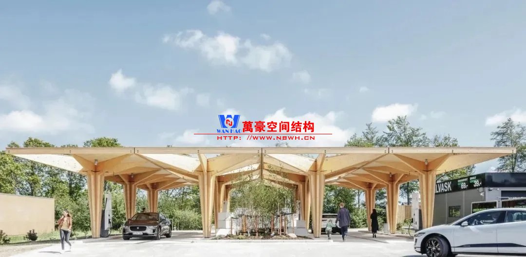 充電站由一系列 “樹” 結構組成。其特征是樹冠狀的頂,過濾陽光并提供遮陽和保護的同時,界定出綠色的環境和平靜的氛圍。這與傳統的加油站形成了強烈的對比,傳統的加油站里車輛排著長隊,到處都是汽油味和汽車尾氣的味道。