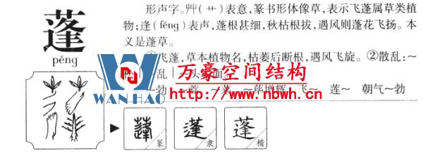 “蓬”,多年生草本植物,花白色,中心黃色,葉似柳葉,子實有毛。字義有散亂、茂盛、旺盛等意,如蓬松、蓬勃。