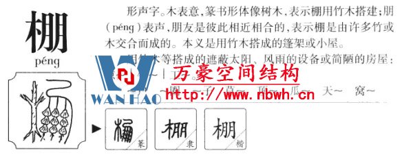 “棚”,用竹木搭成架子,上面覆蓋席、布等做成的遮蔽風(fēng)雨和日光的設(shè)施或簡易小屋,如窩棚、涼棚、工棚。