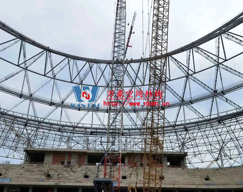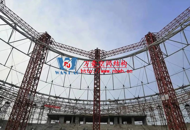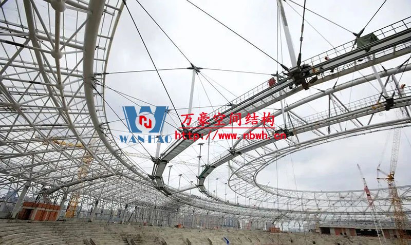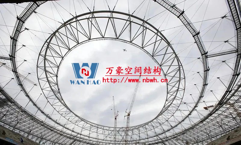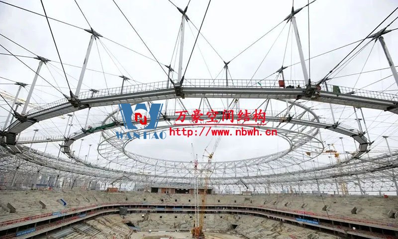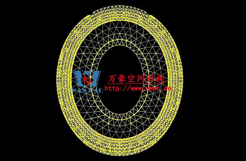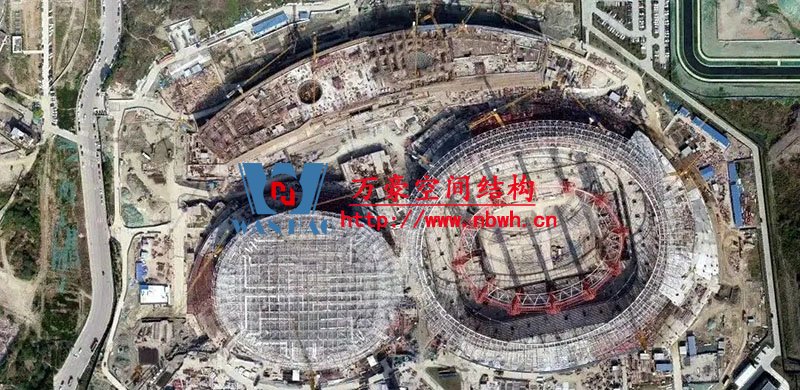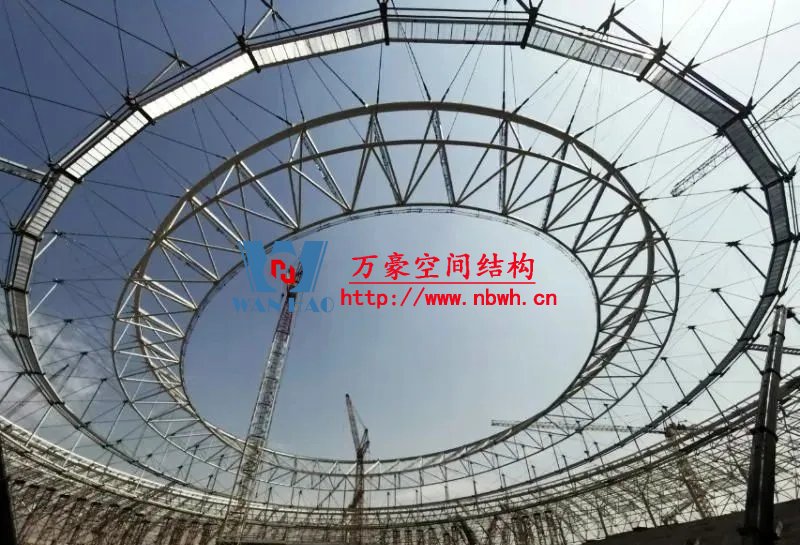 編者按:鳳凰山體育公園專業(yè)足球場(chǎng)屋蓋是全國(guó)首例大開口索穹頂結(jié)構(gòu),最大懸挑跨度約64米,南北跨度約279米,東西跨度234米。外環(huán)為雙層網(wǎng)殼,內(nèi)環(huán)為三角形立體桁架(南端低北端高,最高點(diǎn)標(biāo)高為63米),外環(huán)和內(nèi)環(huán)之間為葵花形索穹頂。