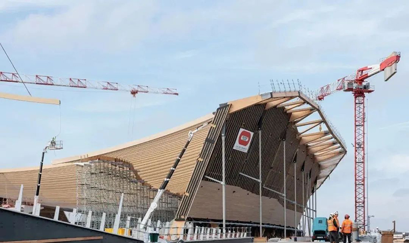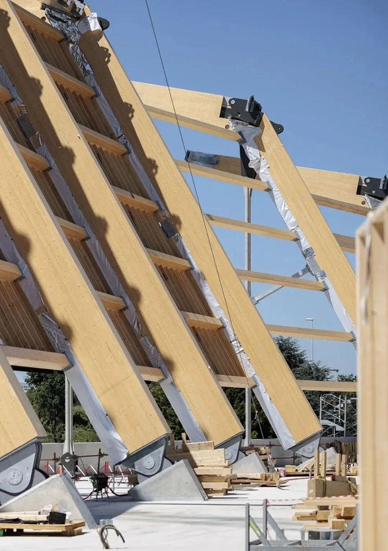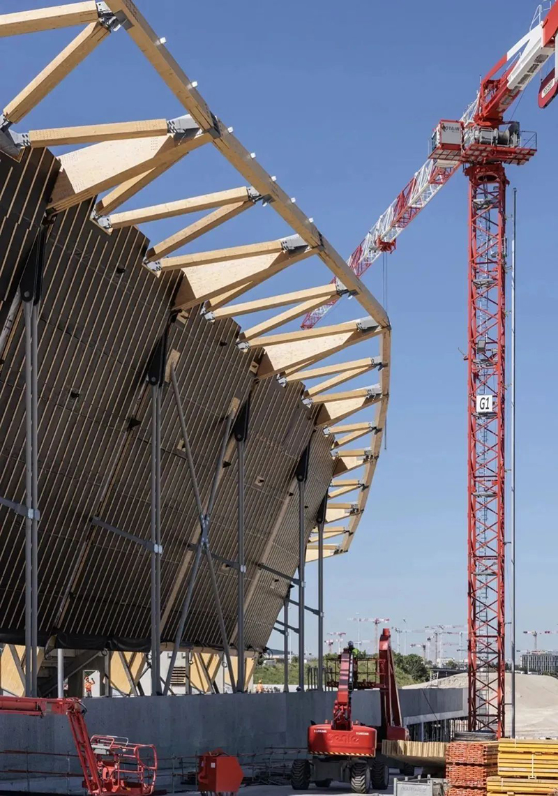 木材是典型的生物基建筑材料之一,是該建筑的主要結(jié)構(gòu)材料。因為木材比其他材料(如混凝土和鋼材)所產(chǎn)生的二氧化碳排放量更少,正好迎合巴黎舉辦歷史上最可持續(xù)的運動會的目標(biāo)。通過在這個巨大的結(jié)構(gòu)中使用木材,該方案將生物材料的使用比例提高了一倍。