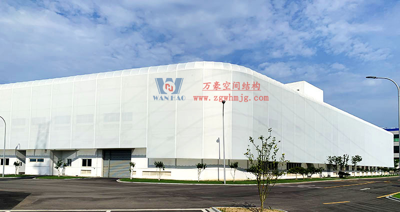 由萬豪承建的紹興國際會展館中心外立面網格織物膜,由5凸5凹不同標高的柔線組合成飄絲帶,視覺效果極具沖擊力。