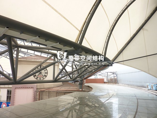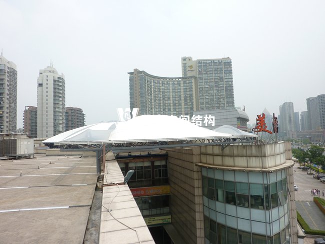 工程位于蕭山開元廣場商業購物中心,整體工程采用骨架穹頂結構,屋面直徑為50米,總面積約6000平方米,屋蓋體系脈絡清晰流暢,造型簡潔有力,力圖體現結構與材料的自身美感,精致的鋼架,潔白的膜材,賦予建筑高技派和未來主義色彩。