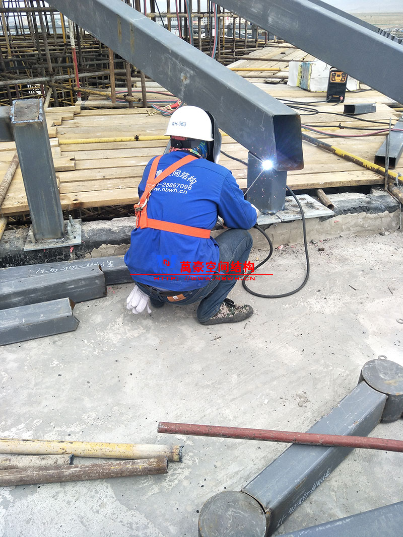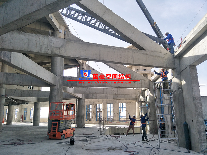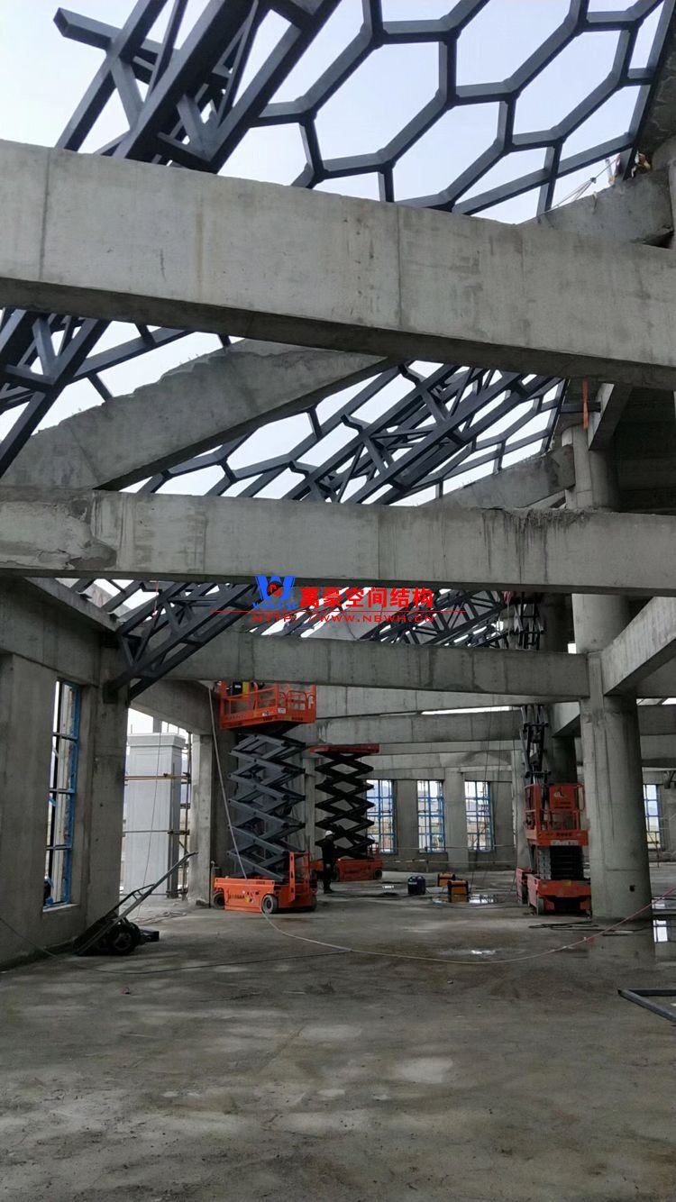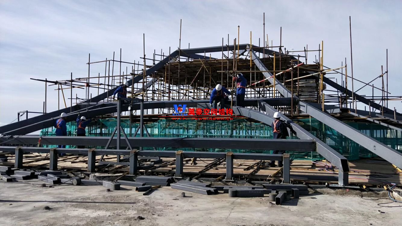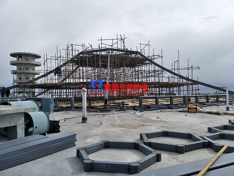 該項目主要分為兩個部分,分別是綜合辦公樓鋼膜結構項目和觀光塔鋼膜結構項目,總用鋼量500噸,膜結構展開面積4000平米。 目前,主樓六邊形、二樓斜屋面每面四根大梁已全部安裝完畢,現在一個面的其他鋼構正在安裝中,穹頂大梁框架完成。 期待工程早日完工,為萬豪再添輝煌。
