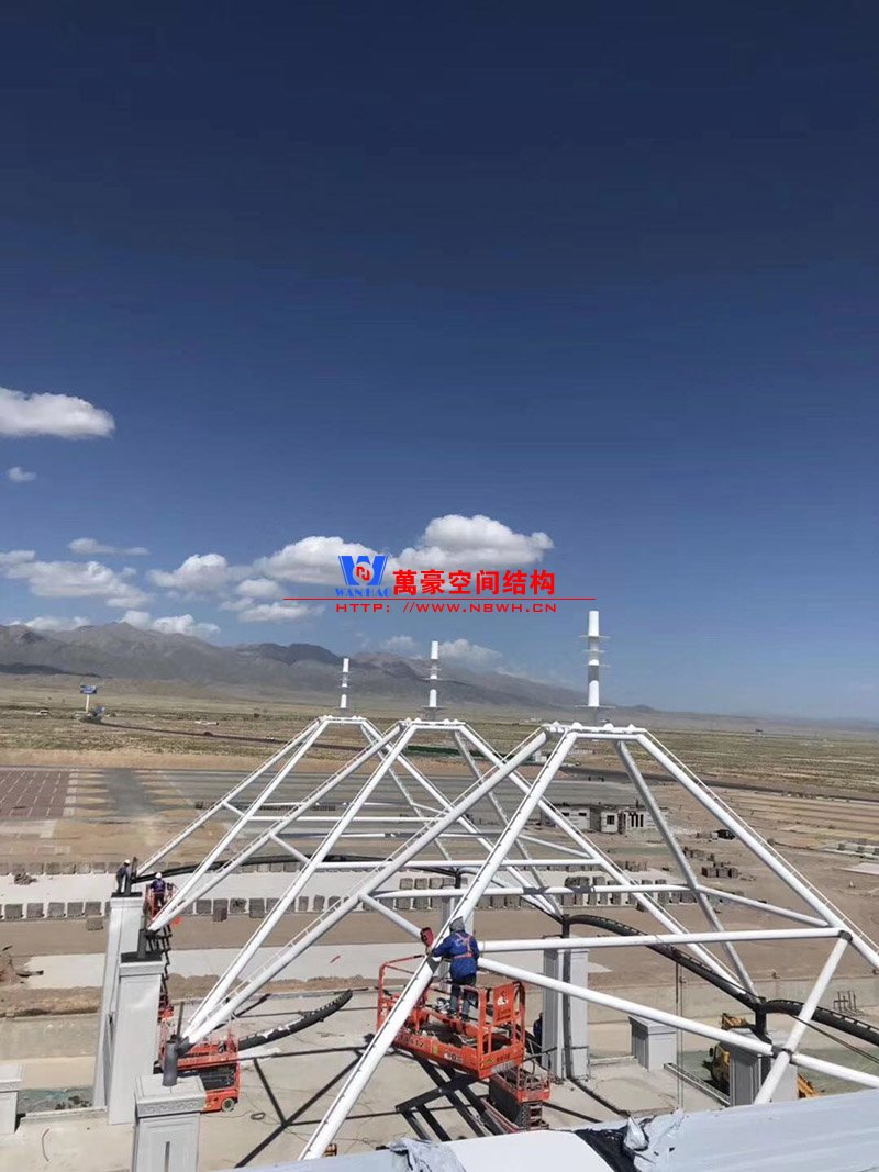 目前觀光塔鋼構已完成五層,六個連廊已完成四個吊裝,穹頂及二樓斜屋面已基本完成。