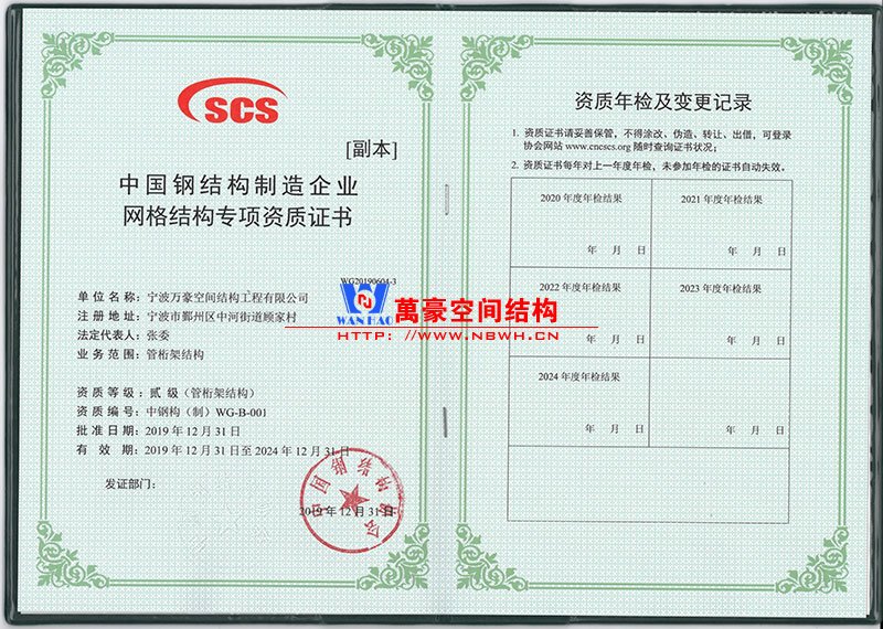 喜訊!喜訊! 萬豪膜結(jié)構(gòu)獲得中國(guó)鋼結(jié)構(gòu)制造企業(yè)網(wǎng)格結(jié)構(gòu)專項(xiàng)資質(zhì)證書。