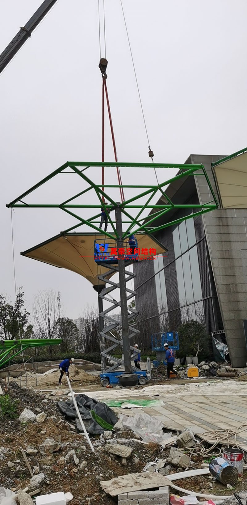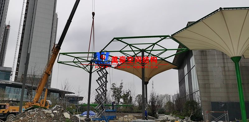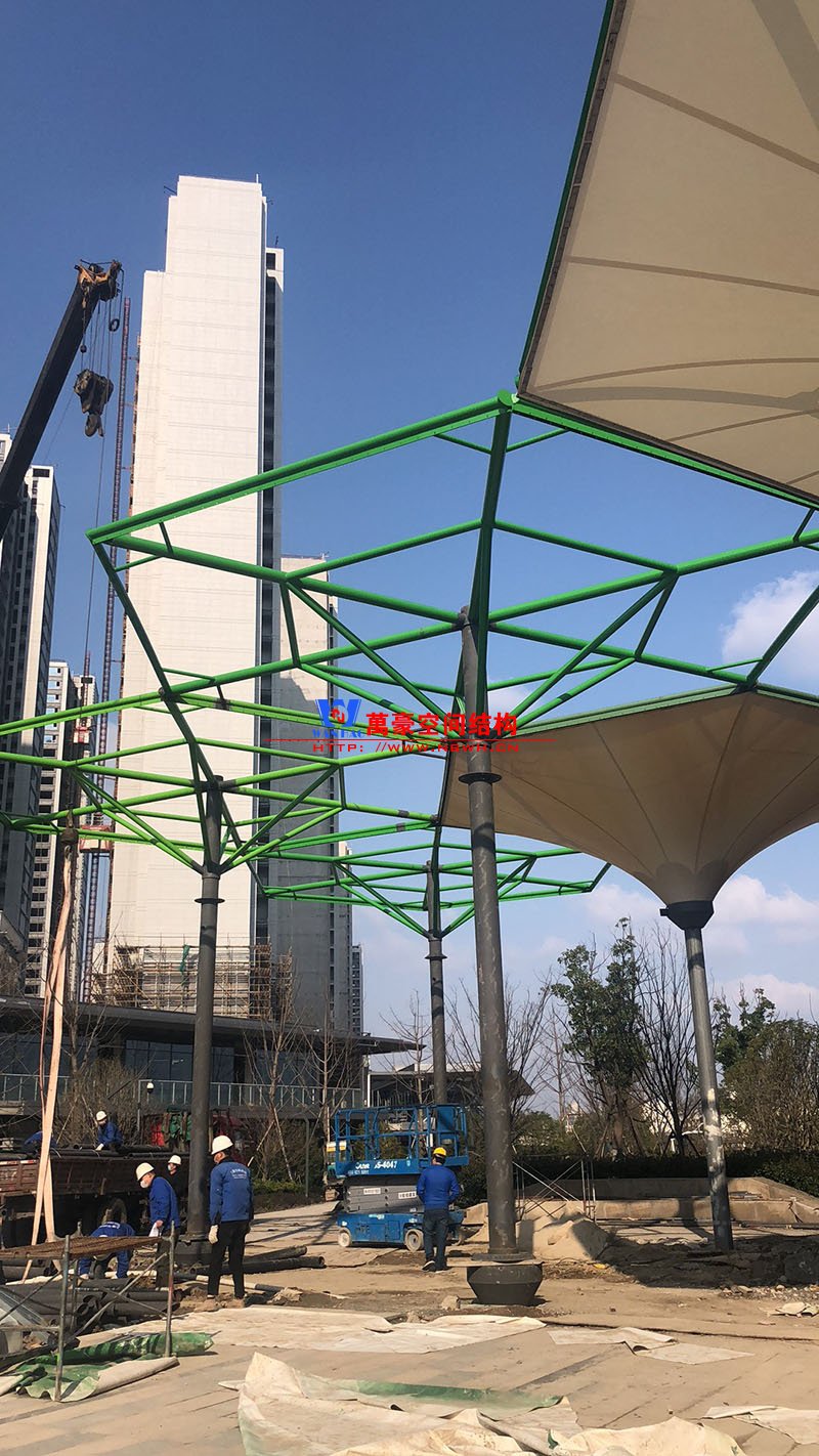 五鄉地鐵站傘狀PTFE膜結構工程位于浙江省寧波市楊柳郡,項目由19座倒傘膜結構組成,倒傘寓意盛開的牽牛花。 該項目膜材使用進口PTFE膜材,膜結構展開面積5000平米,用鋼量100噸,由寧波萬豪空間結構工程有限公司承建。 目前,鋼結構施工進入白熱化階段。期待整個工程的完工,來領略它獨特的風采。