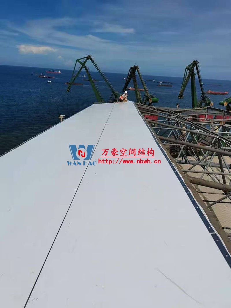 印尼全天候碼頭倉庫屋面膜結構工程高度55米,跨度160米,采用鋼結構地面整體拼裝,分區域整體起吊的安裝方式,鋼用量總共2000噸,膜結構展開面積30000平米,屋面膜結構工程由寧波萬豪空間結構工程有限公司承建。 目前項目進入膜結構安裝階段,萬豪定不負眾望,再創輝煌。