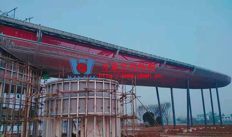 厚實的曲面屋蓋猶如航船底部沉重而又穩(wěn)定前行,船體的側(cè)身內(nèi)部選用了紅色的網(wǎng)格織物膜、外表皮選用了銀色網(wǎng)格織物膜猶如船體本身的防腐耐用與裝甲安全真實效果。主體頂部屋面選用ETFE材料通透明亮,結(jié)合LED燈光在夜幕中可以發(fā)散夜明珠般的光亮。四周肩部選用了銀色防水膜猶如船身防護(hù)層厚實穩(wěn)重,中間保衛(wèi)室的設(shè)計猶如船身部位船艙敞亮實用。