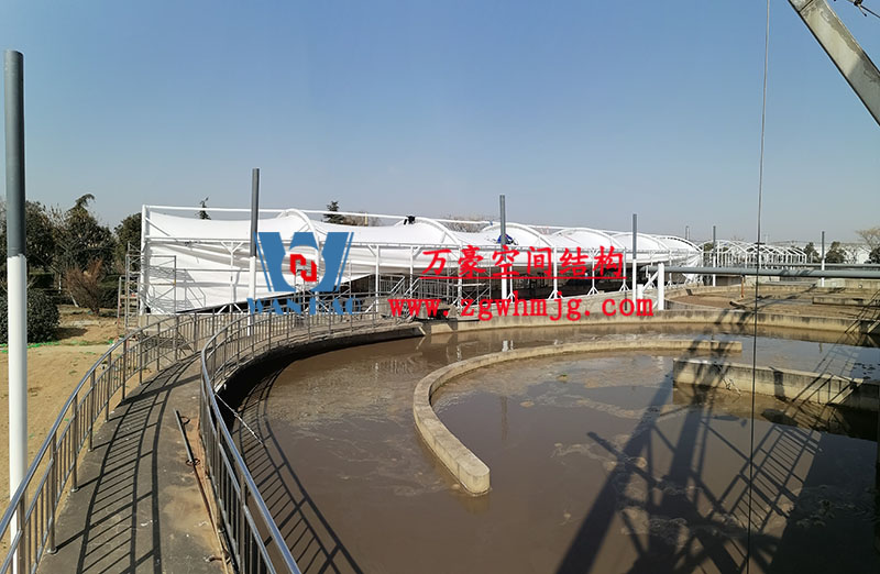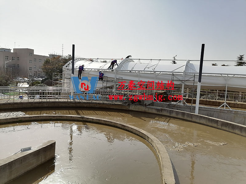 目前,進水口、粗格柵、細格柵、厭氧池兩個池子鋼結構都已完成 ,厭氧池立面膜已張拉,開始裝側面膜,南區氧化溝三個主桁架完成 ,準備進行下一步施工。