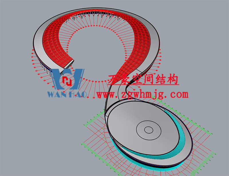項目共有256跨懸挑,其中最大懸挑32m,最小懸挑4m。中間由向上托拱聯接而成,后面與鋁板交接,是常規類大型體育場館。