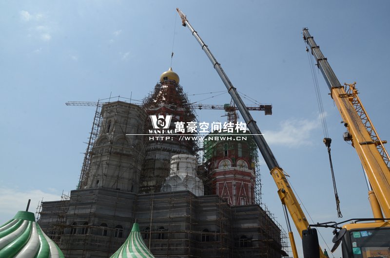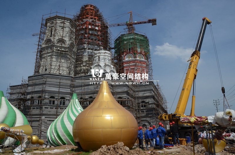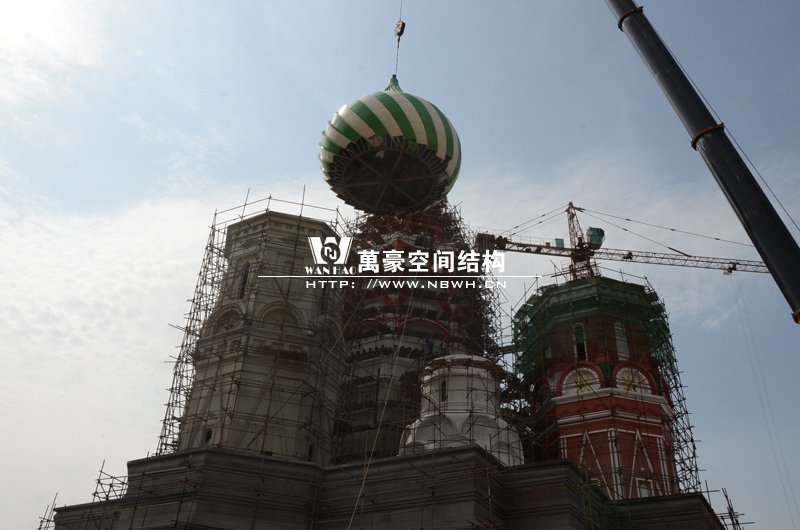 我司承建的橫店影視城圓明新園俄羅斯館已經(jīng)進(jìn)入頂部吊裝階段,本次吊裝難度極大,有著重、高、精等特點(diǎn)。本次吊裝的球體采用鋼結(jié)構(gòu)骨架加鋁合金外殼組成,自重很大,同時(shí)球體在吊裝過程不能變形,對(duì)球體前期的設(shè)計(jì)制作要求高,因其重量大,所以使用了大噸位吊車。本次吊裝高度高,很多都是高空作業(yè)。同時(shí)本次吊裝精度要求高,需要球體和底座按照設(shè)計(jì)要求完美結(jié)合,一次性完成吊裝,需要吊裝人員做好協(xié)調(diào)溝通工作,配合毫無誤差。4月17日天氣晴朗風(fēng)速低,是吊裝的有利天氣,首先吊裝相關(guān)人員設(shè)備做好準(zhǔn)備工作,之后先吊裝1號(hào)球體,在1號(hào)球吊裝完畢無誤固定后再吊裝5號(hào)球體,當(dāng)天吊裝好1號(hào)球體和5號(hào)球體。